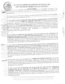 Sin embargo, tras falsificar firmas e inflar asistencia dentro un acta ilegal realizada supuestamente en un Palacio Municipal que se encontraba siendo bloqueado por pobladores de dicha comunidad, Soriano Ventura certificó el fraude electoral por medio del cual pretende evadir a la justicia, según dicho de la población Primitivo Soriano Ventura tuvo que “billetear” a funcionarios del IEEPCO, como lo son Beatriz Teresa Casas y los Consejeros Wilfrido Lulio Almaraz y Rita Bell López Vences, quienes habrían recibido 1.5 millones de pesos, para dar visto bueno de un acta ilegal.